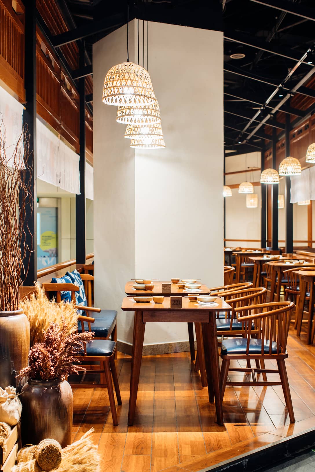贵州当地少数民族的特色竹编,装饰在就餐空间,风雨桥靠椅与蓝印花蜡染融合在一起。把贵州民艺资产元素,用做连线题的方式结合。