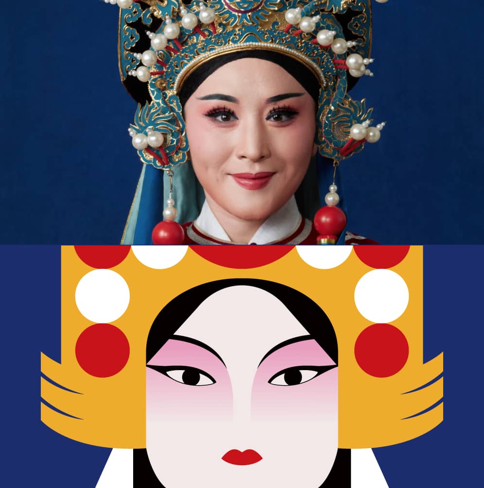 这四个人物不但是经典豫剧角色,它们传唱的故事也是中国人家喻户晓的。我们用扁平化的视觉语言提炼了人物扮相,以几何化的现代审美进行了重构。老戏,新唱,既保留了戏曲脸谱的经典韵味,又在细节的处理上充满轻松和潮流的现代感。