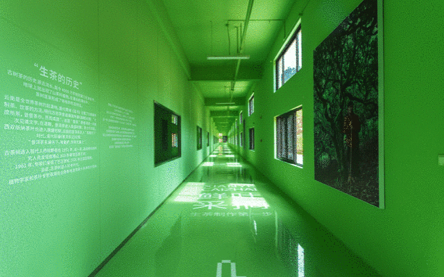 在博物馆旁的生产车间设有雨林主营的古树普洱生茶、古树普洱熟茶、古树红茶三大茶类的参观通道,所以我们以绿、黄、红三种颜色为主色进行设计,配以图片和参观窗口,带来现代化工厂的沉浸式体验感。