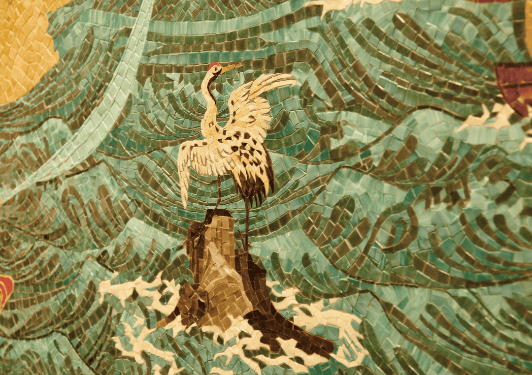 那么在消费者的“第一现场”我们把海上丝绸之路地图作为品牌图腾在入口处以马赛克手工剪画的方式做了一幅巨幅画面。画面由上万颗独一无二的玻璃瓷片手工拼剪而成,在质感表达的同时,让文化IP在顾客体验的第一视角呈现。站在大堂场域的中心用品牌图腾宣告了品牌的文化血统和文化IP。