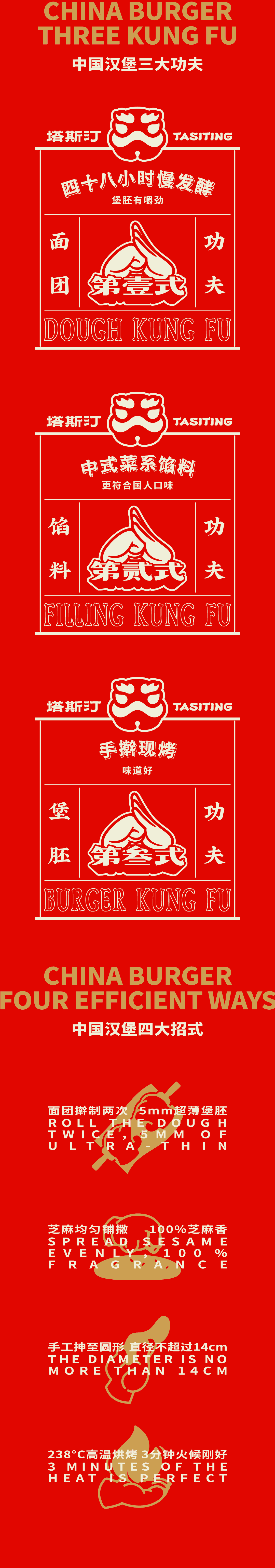 基于功夫文化,我们为塔斯汀外化了塔斯汀的信任状,提炼了汉堡的“三大功夫”和堡胚的“四大招式”。