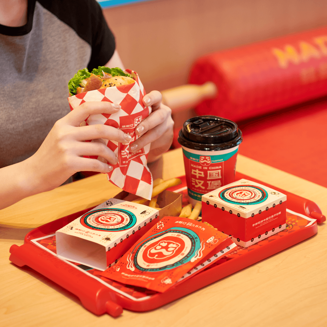 红色是活力,是“国潮”,是塔斯汀已经建立起的品牌资产,是不可退让的品牌护城河,是手擀现烤中国汉堡开创者。红色兼具了快餐品类的效率和食欲感,同时占据了“正宗”身份。